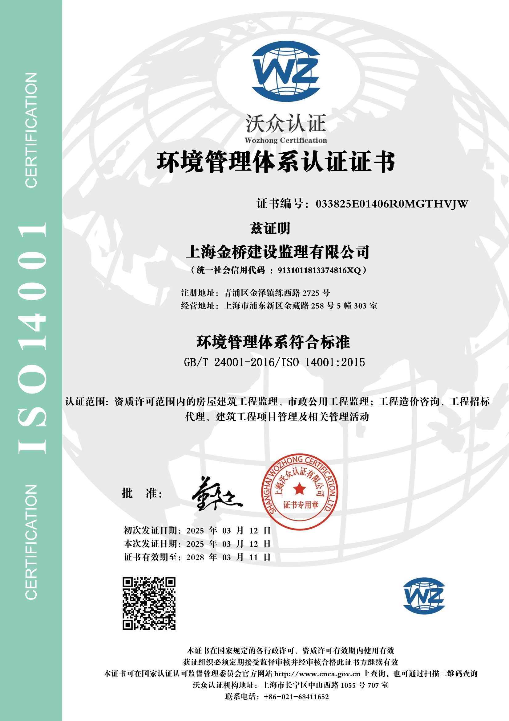 2025年ISO14001环境管理体系认证证书(英文版)