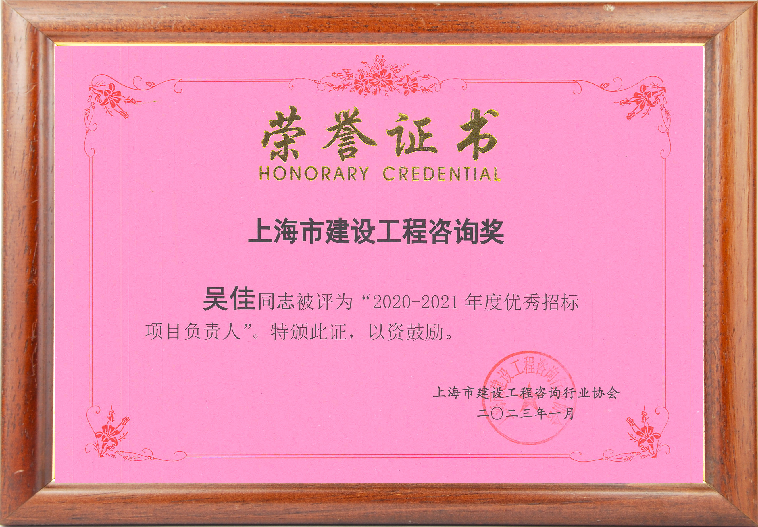 2020-2021年度上海市优秀招标项目负责人(吴佳)